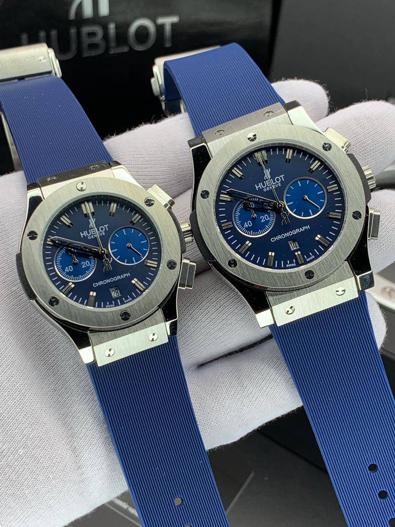 ساعت مچى زنانه و مردانه هابلوت صفحه گرد آبی بند سرمه ای