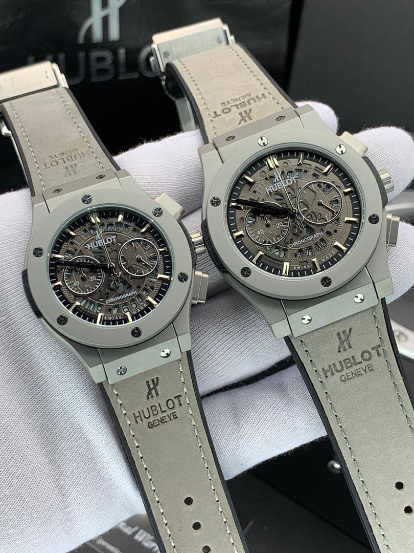ساعت مچى زنانه و مردانه هابلوت صفحه گرد خاکی بند طوسی