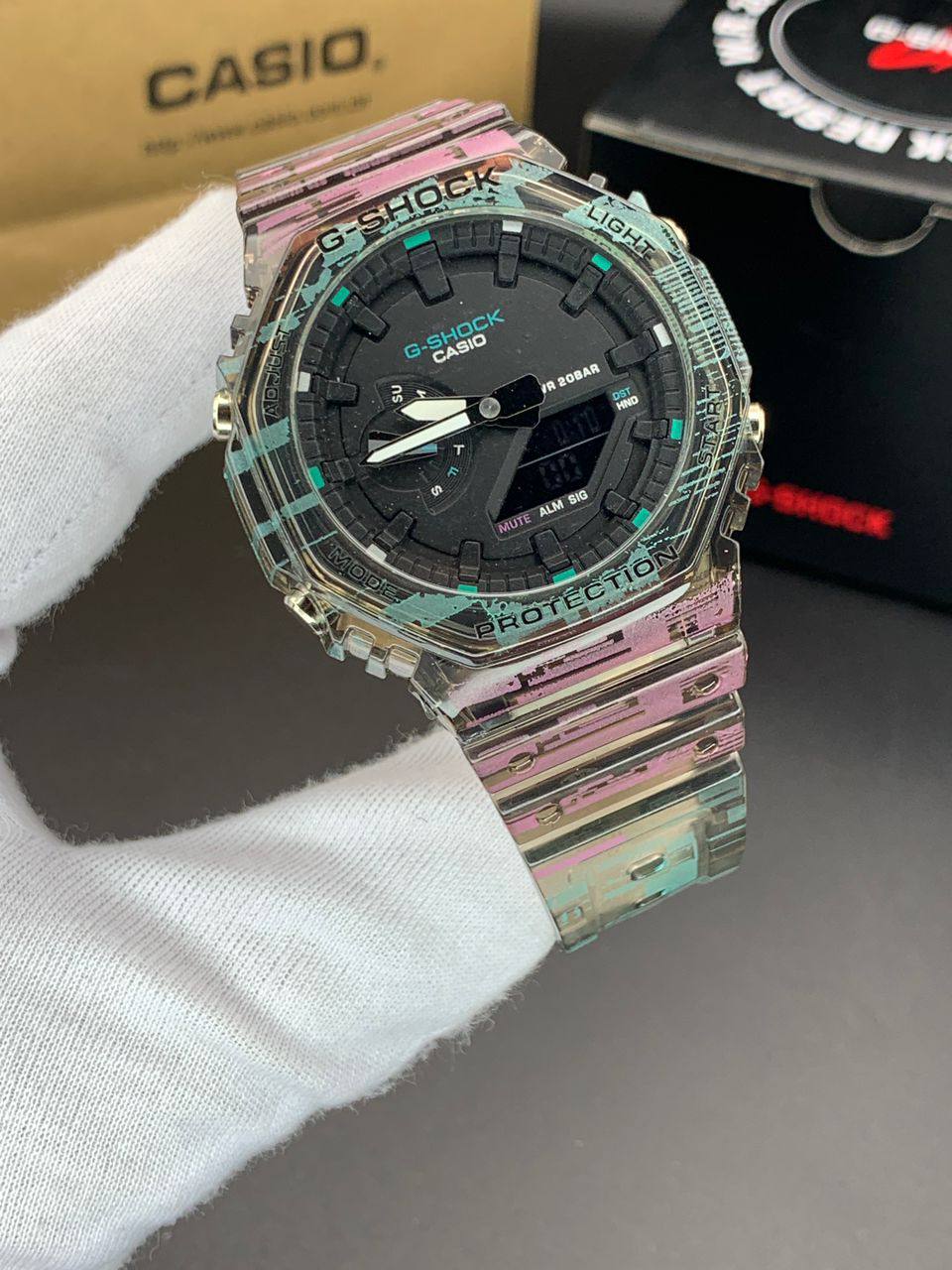 ساعت مچی کاسیو جیشاک مدل GA-2100 صفحه مشکی دور شفاف بند رنگی