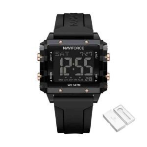 کالا اصلی و شرکتی با ضمانت اصالت موتور دیجیتال ساخت ژاپن با کیفیت عالی مقاوم در برابر آب (در حد پاشش آب) قطر صفحه : 41 میلیمتر ضخامت ساعت :  14.5 میلیمتر وزن ساعت : 54 گرم به همراه جعبه و پاکت شیک مارک نیوی فورس دارای دو سال گارانتی شرکت نیوی فورس