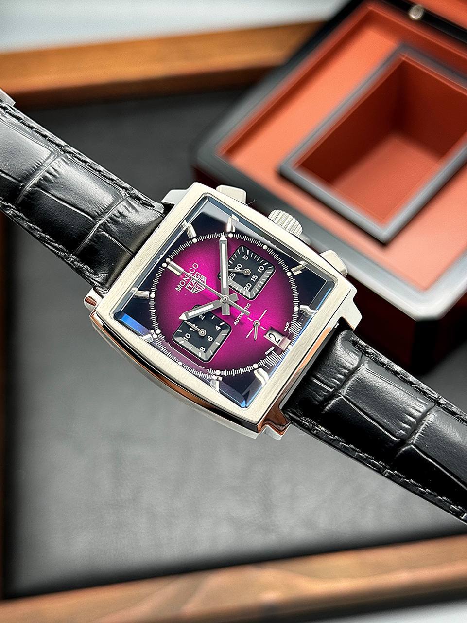 ساعت مچی مردانه تگ هویر موناکو Tag Heuer Monaco – سرخابی/ بند مشکی