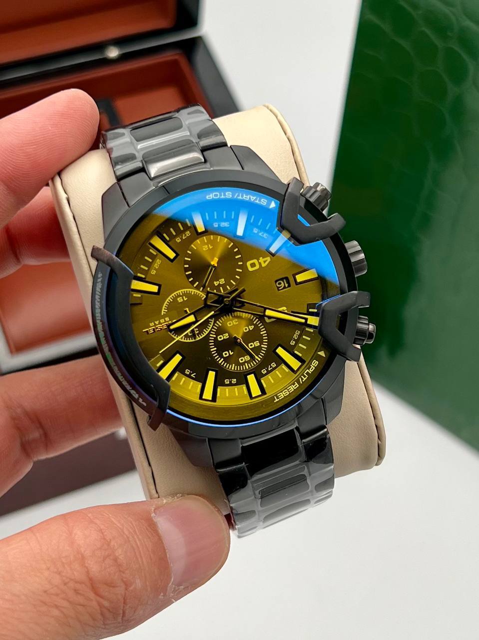 1.ساعت دیزل مدل Mega Chief: این ساعت دارای قاب بزرگ و طراحی مدرن است که باعث جلب توجه می‌شود. دارای صفحه زیرکوارتز و بند چرمی مقاوم است.