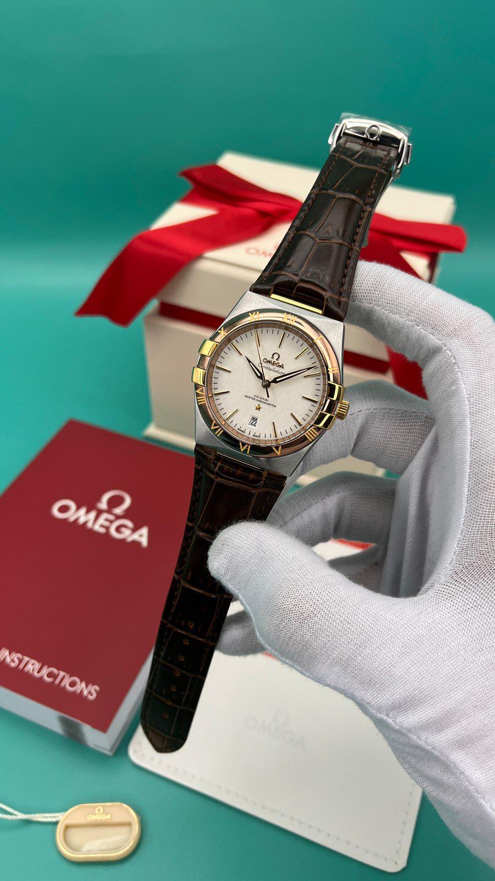 ساعت مچی امگا کانسلیشن بند چرم مردانه صفحه صدفی دور طلایی