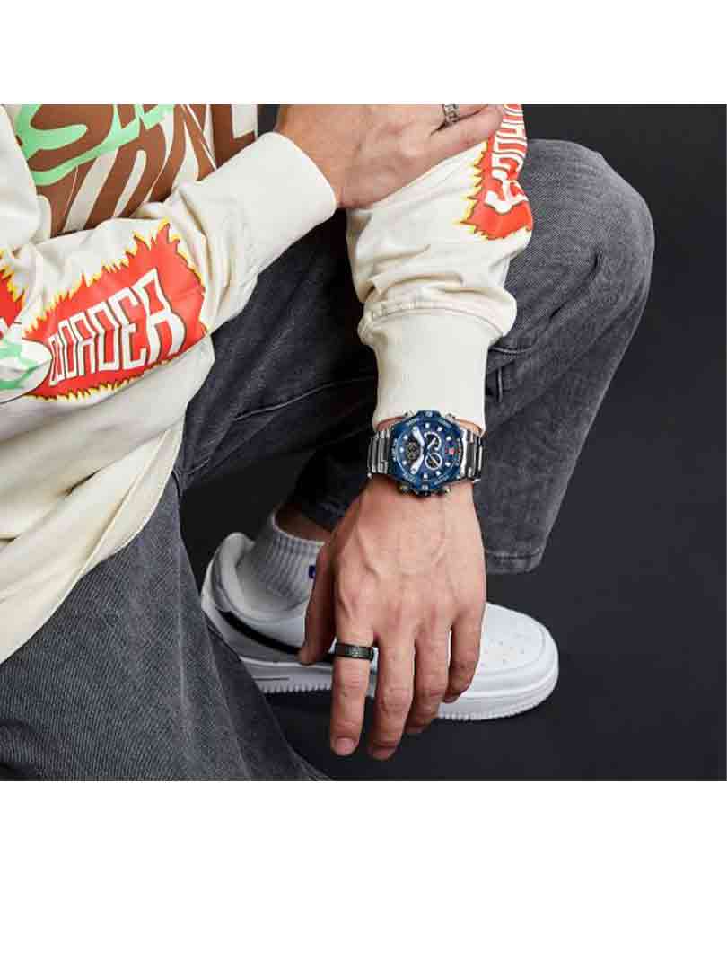 مدل نیوی فورس NF8202این ساعت دارای قاب گرد با طراحی مینیمال و شیک است. صفحه نمایش آن آنالوگ بوده و از ویژگی های آن می توان به ضد آب بودن، نمایش تاریخ و ساعت دومی اشاره کرد. این ساعت دارای بند فلزی با روکش PVD می باشد.