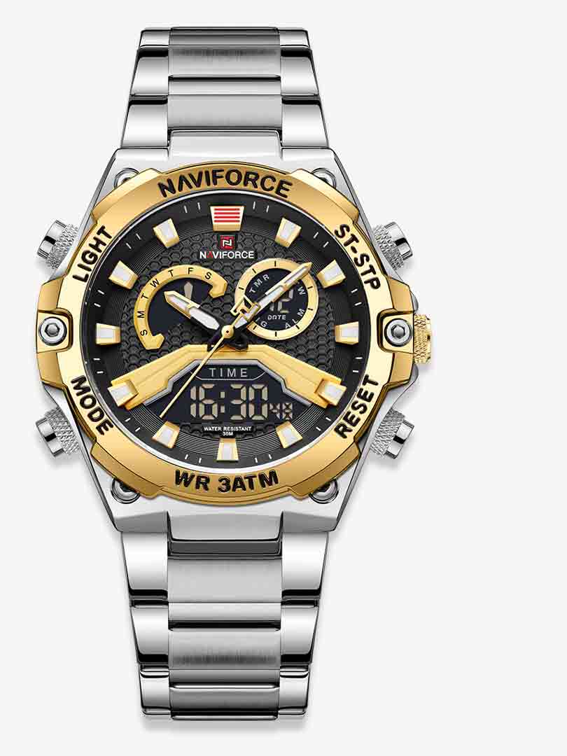 مدل نیوی فورس NF8202این ساعت دارای قاب گرد با طراحی مینیمال و شیک است. صفحه نمایش آن آنالوگ بوده و از ویژگی های آن می توان به ضد آب بودن، نمایش تاریخ و ساعت دومی اشاره کرد. این ساعت دارای بند فلزی با روکش PVD می باشد.