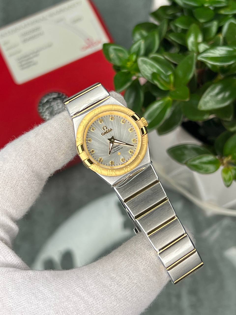 ساعت مچی زنانه امگا کانسلیشن صفحه سیلور طلایی و نقره ای اندکس نگین OMEGA CONSTELLATION