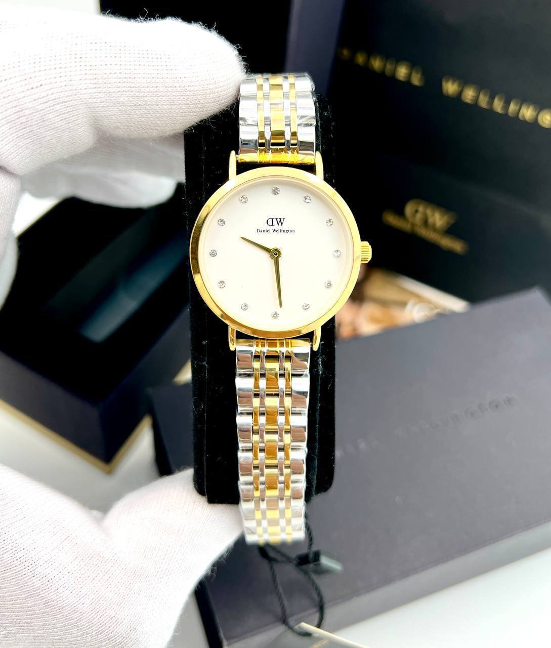 ساعت مچی زنانه دنیل ولینگتون DW صفحه سفید بند سه خط استیل طلایی