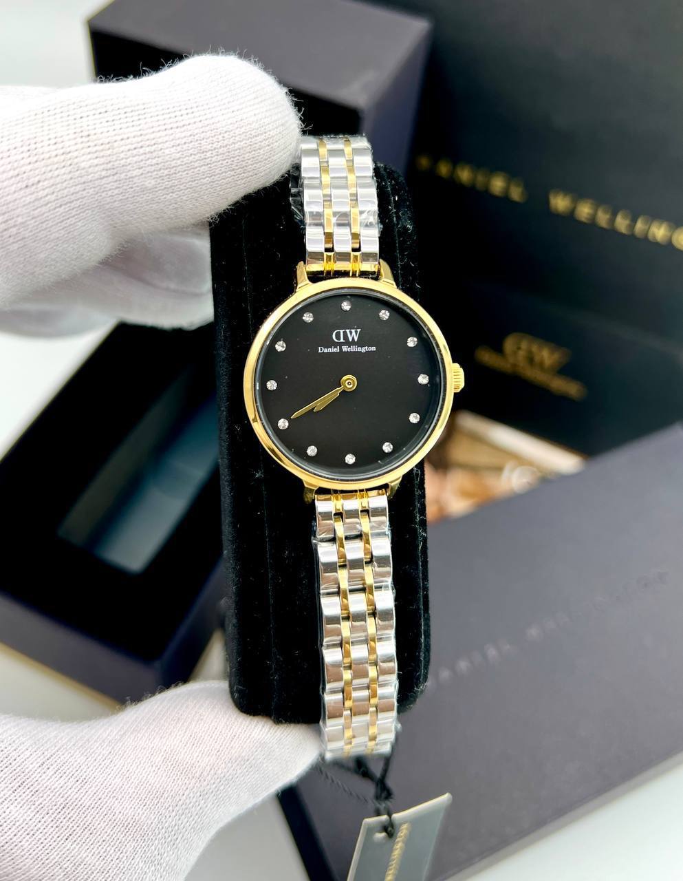 ساعت مچی زنانه دنیل ولینگتون DW صفحه مشکی بند استیل طلایی