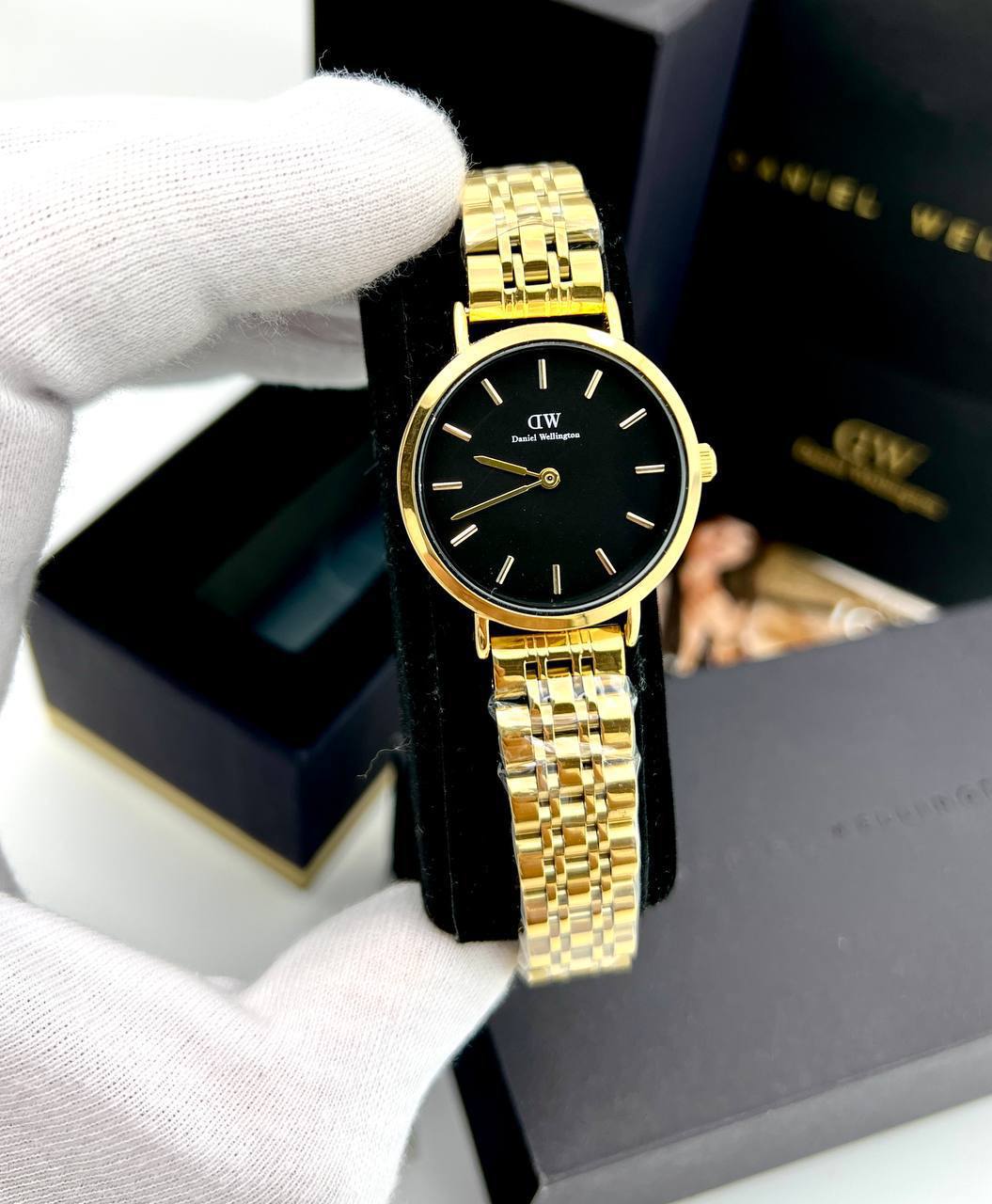 ساعت مچی زنانه دنیل ولینگتون DW صفحه مشکی اندیس خطی بند طلایی