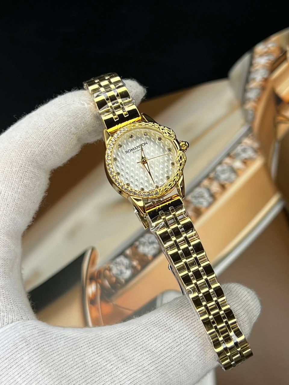 ساعت مچی زنانه رومنسون کلاسیک صفحه گرد سفید نگین دار بند طلایی
