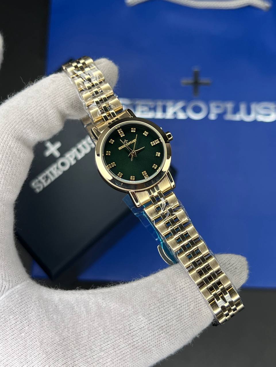 ساعت مچی زنانه سیکو پلاس SEIKO PLUS+ صفحه سبز نگین دار بند طلایی