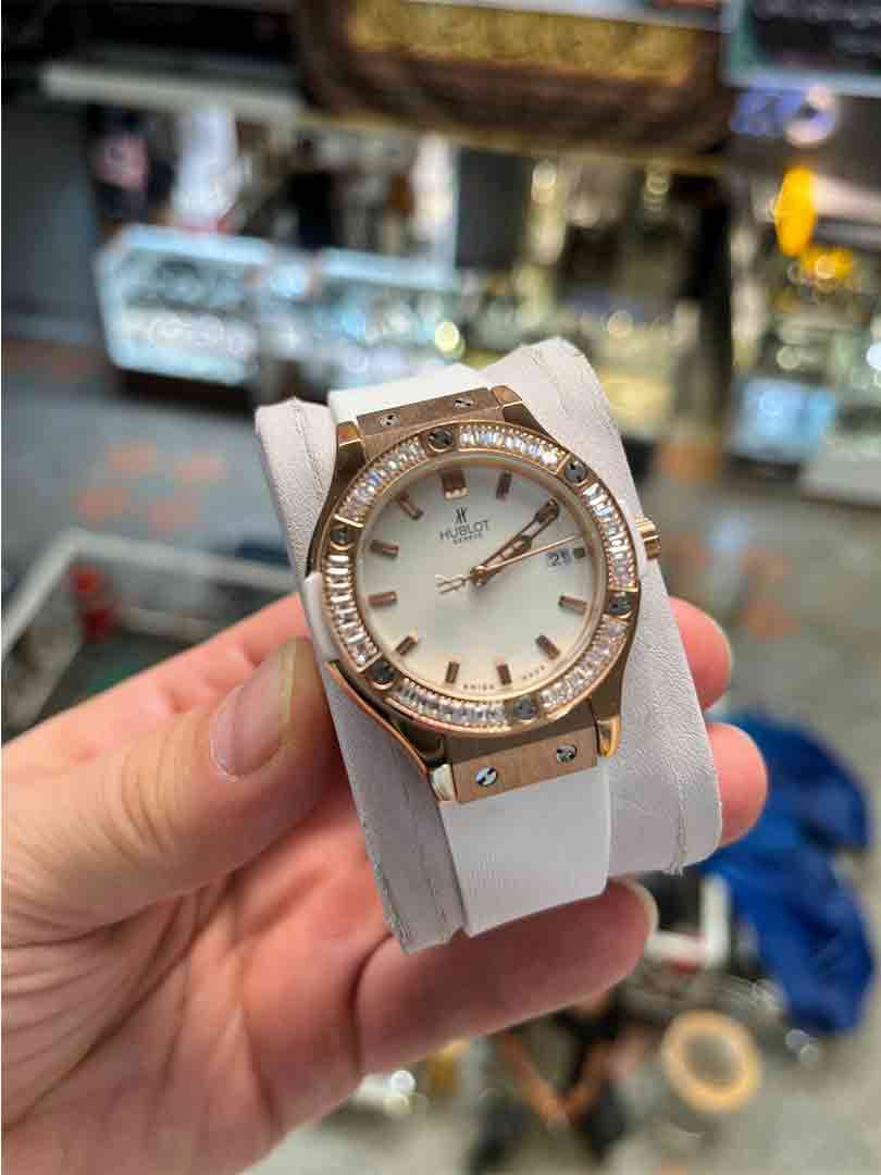 ساعت مچی زنانه هابلوت دور نگین بند سفید قاب رزگلد صفحه سفید مدل Hublot Diamonds