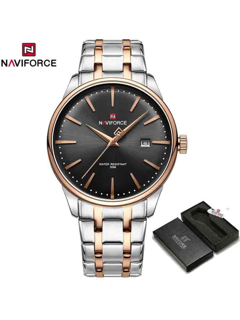 مدل نیوی فورس NF8202این ساعت دارای قاب گرد با طراحی مینیمال و شیک است. صفحه نمایش آن آنالوگ بوده و از ویژگی های آن می توان به ضد آب بودن، نمایش تاریخ و ساعت دومی اشاره کرد. این ساعت دارای بند فلزی با روکش PVD می باشد.