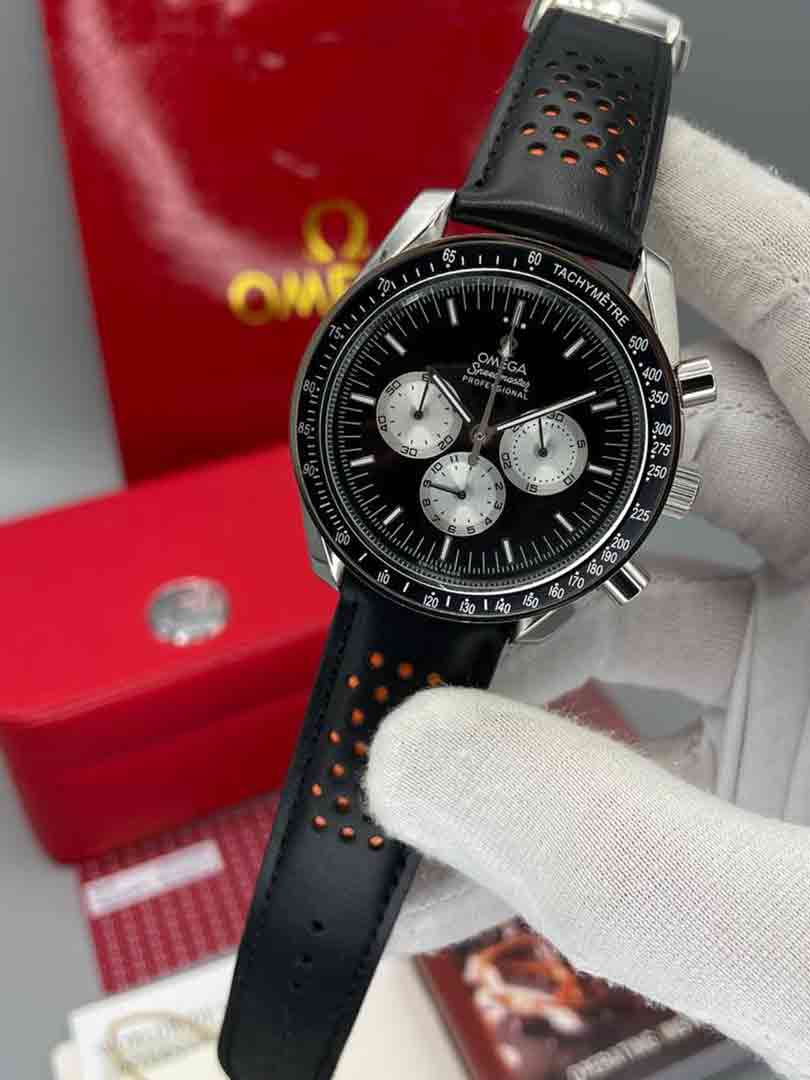 ساعت مچی مردانه امگا اسپید مستر بند چرم مشکی نقره ای Omega Speedmaster