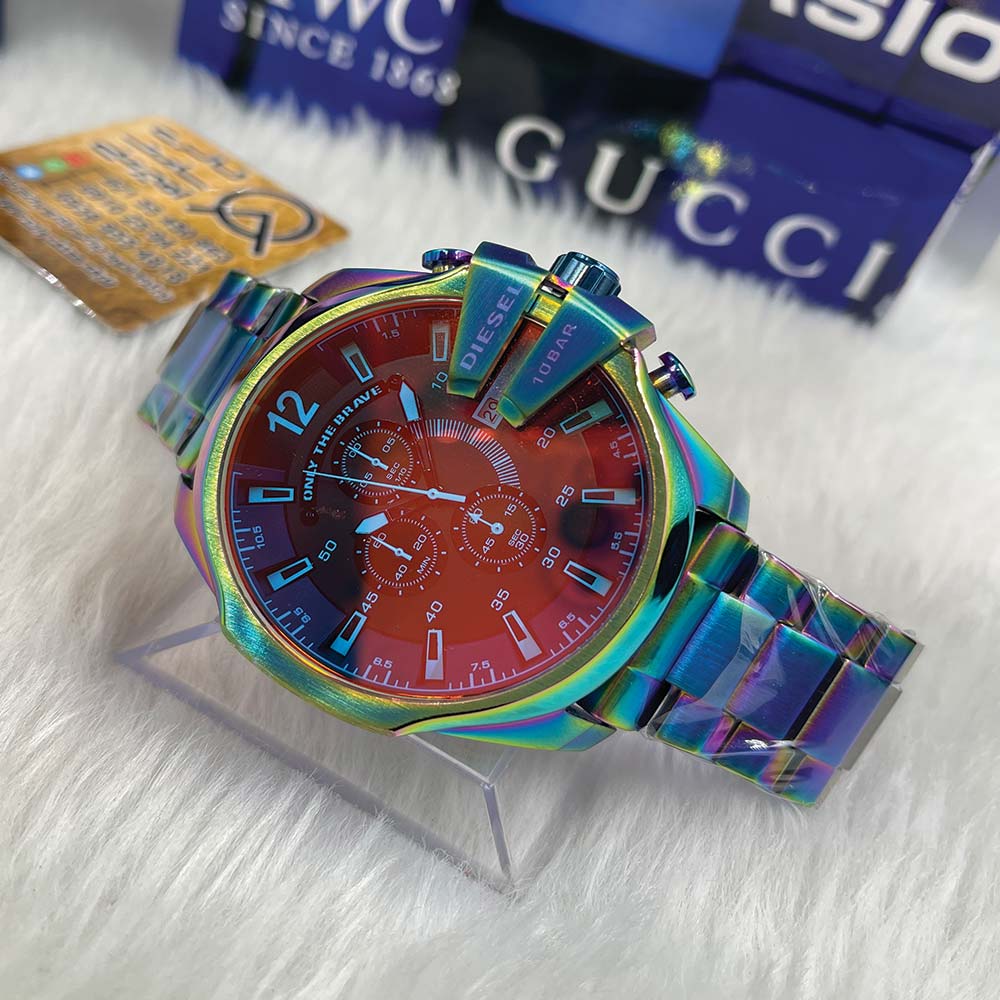 1.ساعت دیزل مدل Mega Chief: این ساعت دارای قاب بزرگ و طراحی مدرن است که باعث جلب توجه میشود. دارای صفحه زیرکوارتز و بند چرمی مقاوم است.