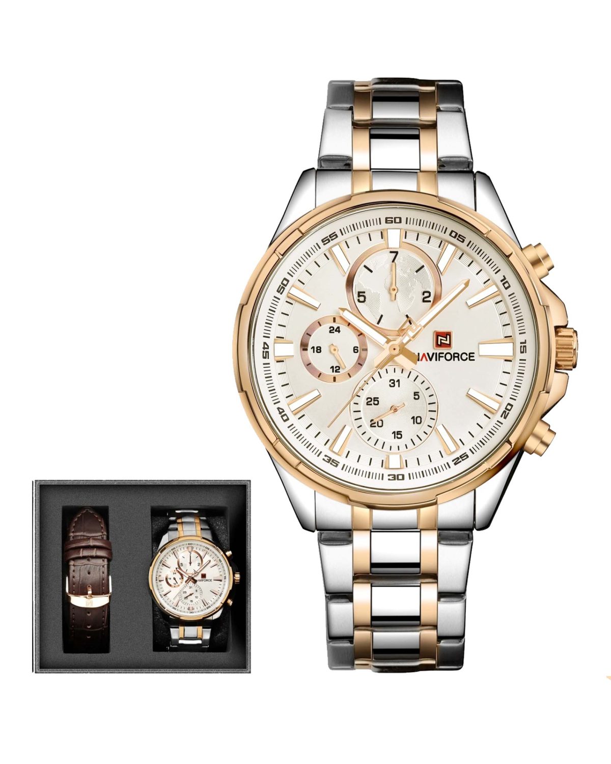 مدل نیوی فورس NF8202این ساعت دارای قاب گرد با طراحی مینیمال و شیک است. صفحه نمایش آن آنالوگ بوده و از ویژگی های آن می توان به ضد آب بودن، نمایش تاریخ و ساعت دومی اشاره کرد. این ساعت دارای بند فلزی با روکش PVD می باشد.