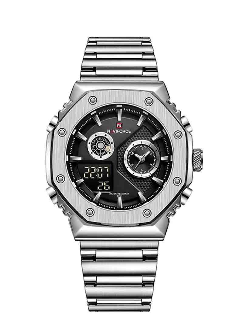 مدل نیوی فورس NF8202این ساعت دارای قاب گرد با طراحی مینیمال و شیک است. صفحه نمایش آن آنالوگ بوده و از ویژگی های آن می توان به ضد آب بودن، نمایش تاریخ و ساعت دومی اشاره کرد. این ساعت دارای بند فلزی با روکش PVD می باشد.