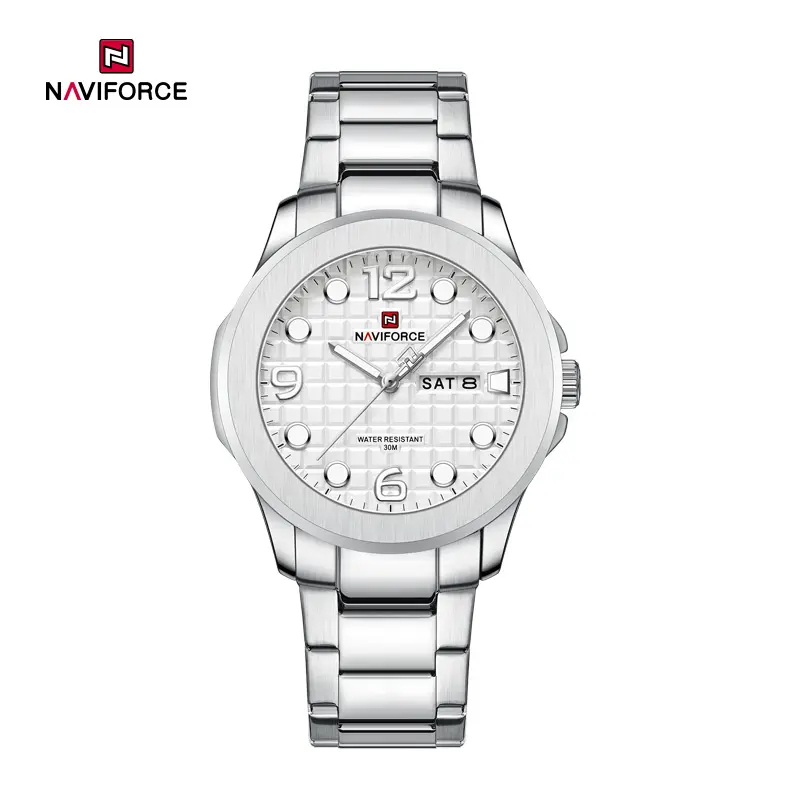 کیفیت ساخت:  نیوی فورس از مواد با کیفیت برای ساخت ساعت‌های خود استفاده می‌کند. این مواد شامل استیل ضدزنگ، شیشه معدنی مقاوم در برابر خراش، و بندهای چرمی یا فلزی است. این انتخاب‌ها باعث می‌شوند که ساعت‌های نیوی فورس دوام و استحکام بالایی داشته باشند.