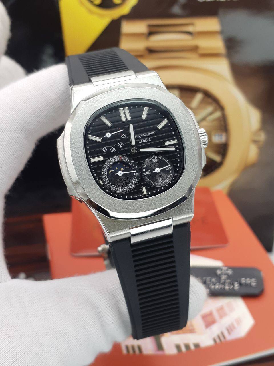 ساعت مچی پتک فیلیپ ناتیلوس مدل پاور گیج صفحه مشکی بند چرمی مشکی