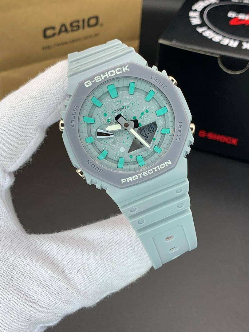 ساعت مچی کاسیو جیشاک مدل GA-2100 صفحه آبی فیروزه ای دور طوسی بند آبی