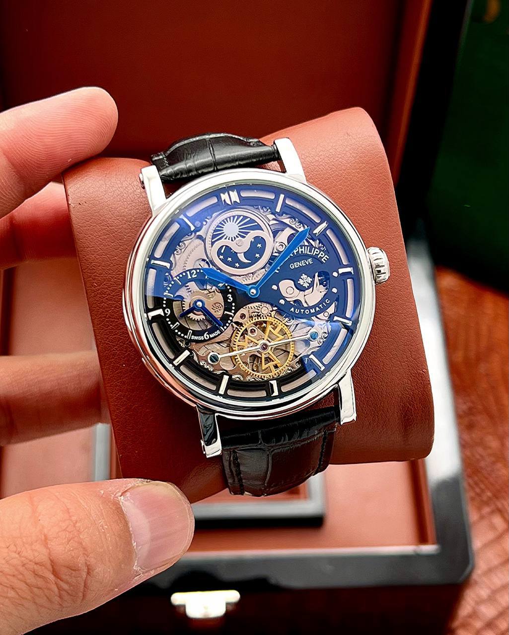ساعت مچی مردانه پتک فیلیپ اوپن هارد صفحه آبی بند چرمی مشکی دور استیل Patek Philippe
