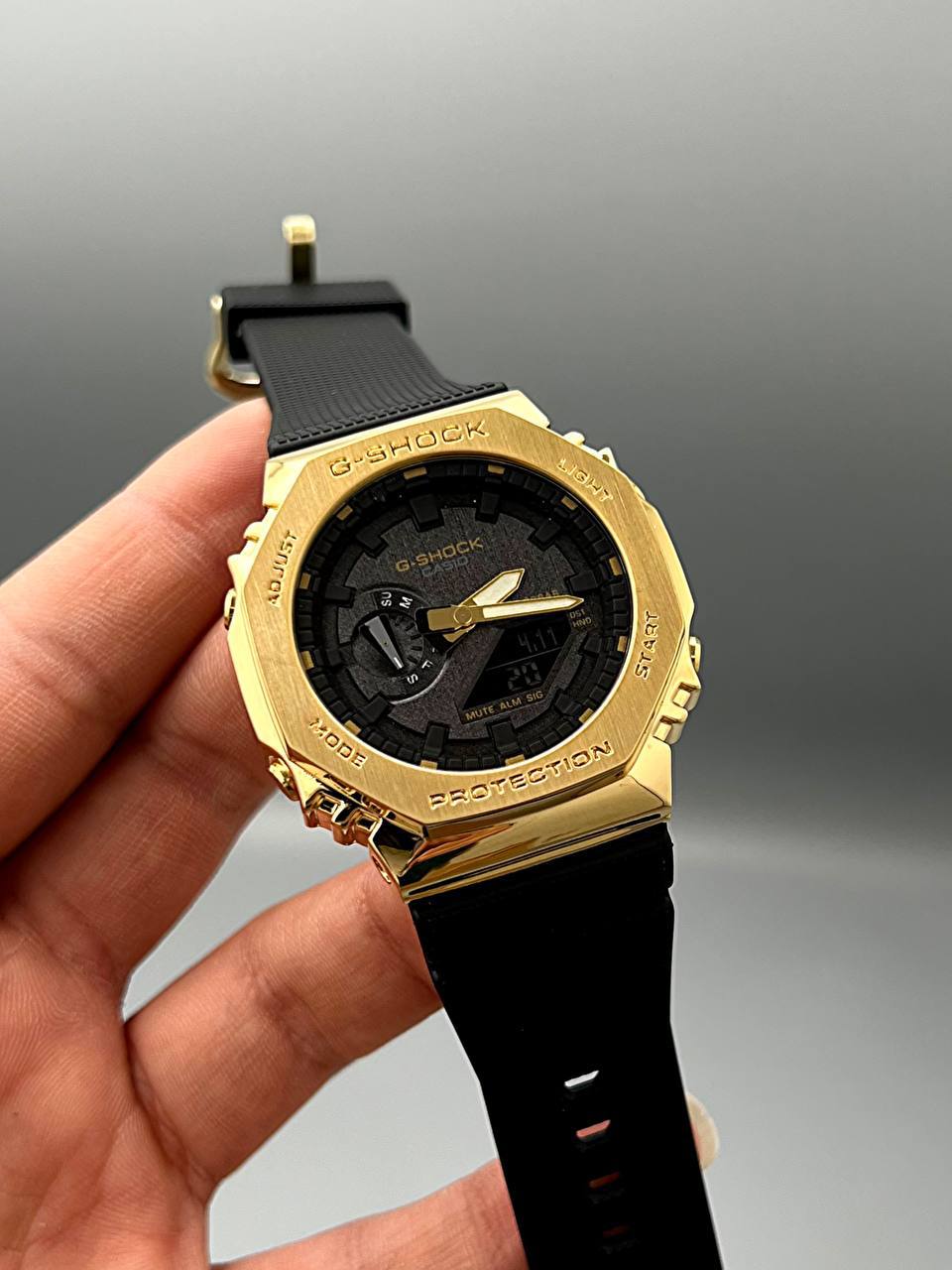 کاسیو جیشاک مدلGA-2100 قاب فلزی صفحه مشکی دور طلایی